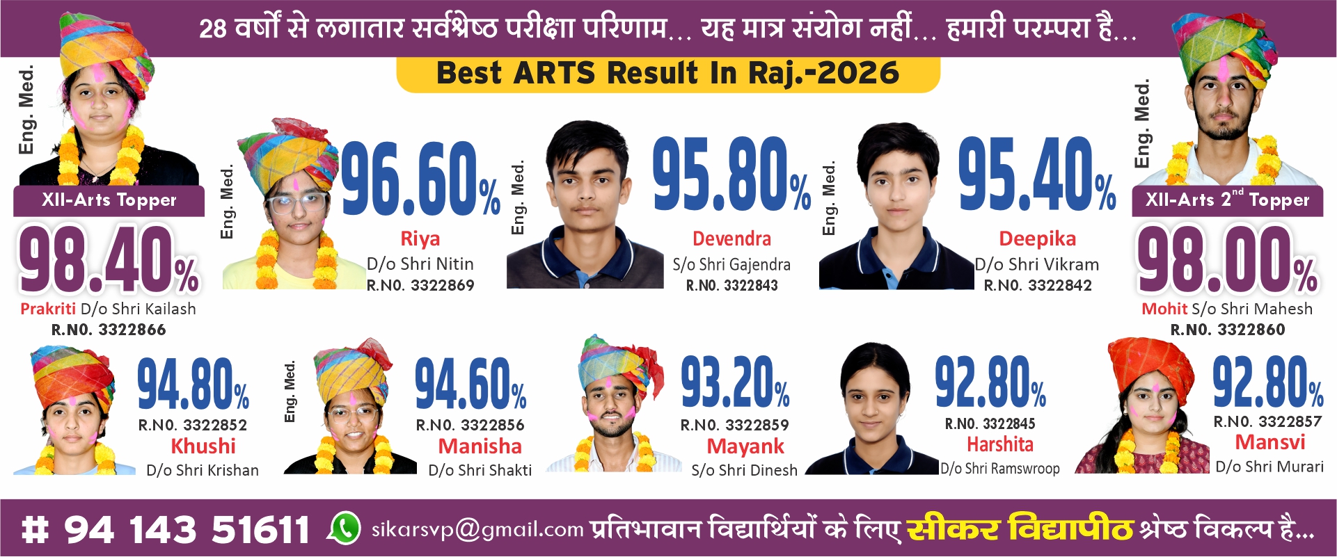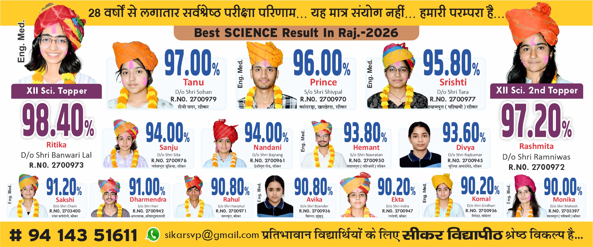 Sikar Vidyapeeth Public School (Reg. No. 3/sikar 98-99, Affiliation No. R7358/2007/R6412-416 with RBSE), Sikar Rajasthan is a